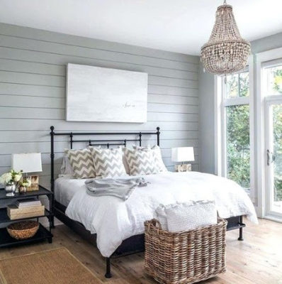 Shiplap is popular in farmhouse and cottage style homes as well as contemporary and traditional. The boards are installed horizontally (not vertically, which would then just be wood panels.) White is the most popular color; natural/rustic add texture. Here, a gray painted shiplap is used in the bedroom. Have a bare wall? Be creative!